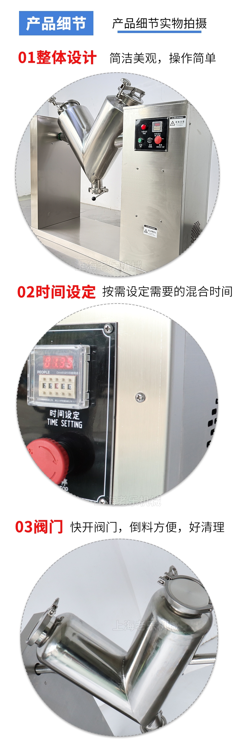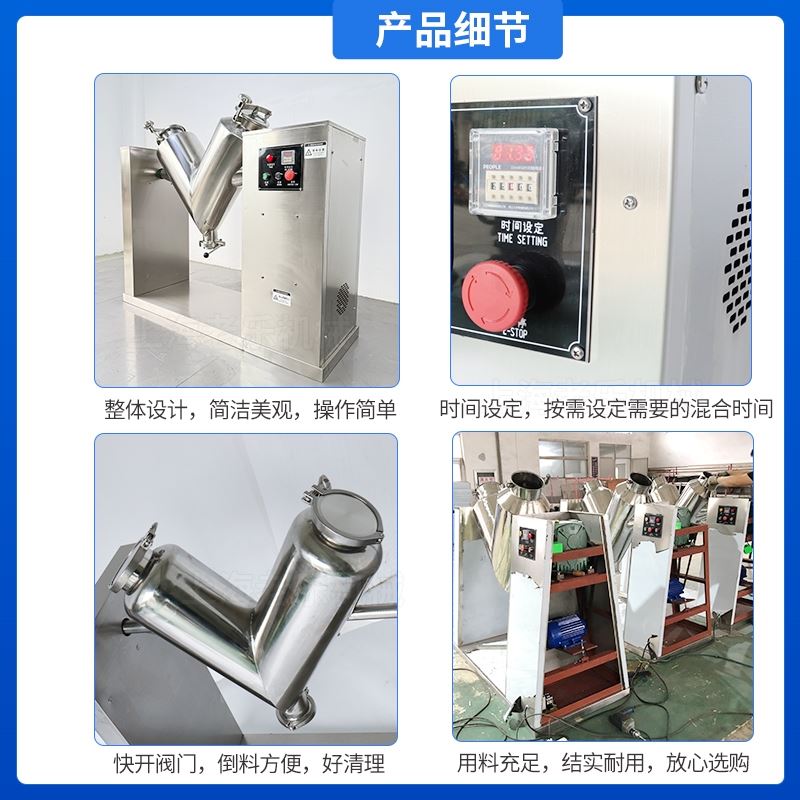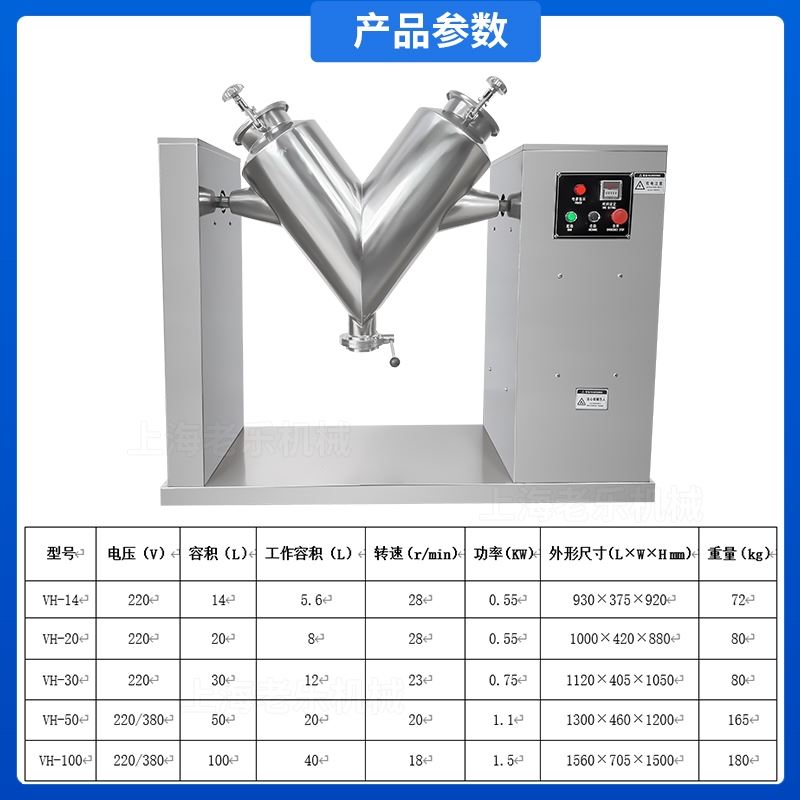 简要描述:1、小型双臂V型混合机,设计美观,操作简单2、可定时混合,设置方便3、快拆阀门,不锈钢材质,清理方便V型混合机用于一切流动性较好的干性粉状或颗粒状物料的混和。它适用于化工、食品、医药、饲料、陶瓷、冶金等行业的粉料或颗料状物料的混和。该机结构合理、简单、操作密闭,进出料方便,(人工或真空加料)筒体采用不锈钢材料制作,便于清洗。