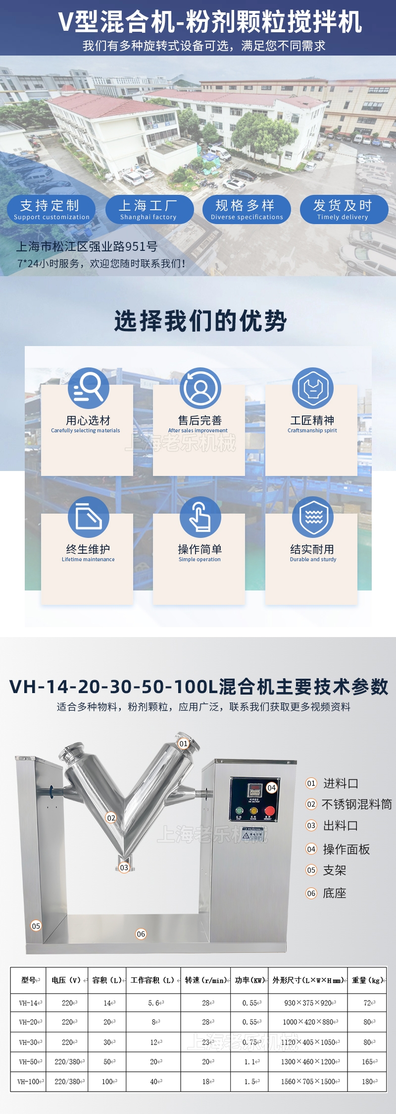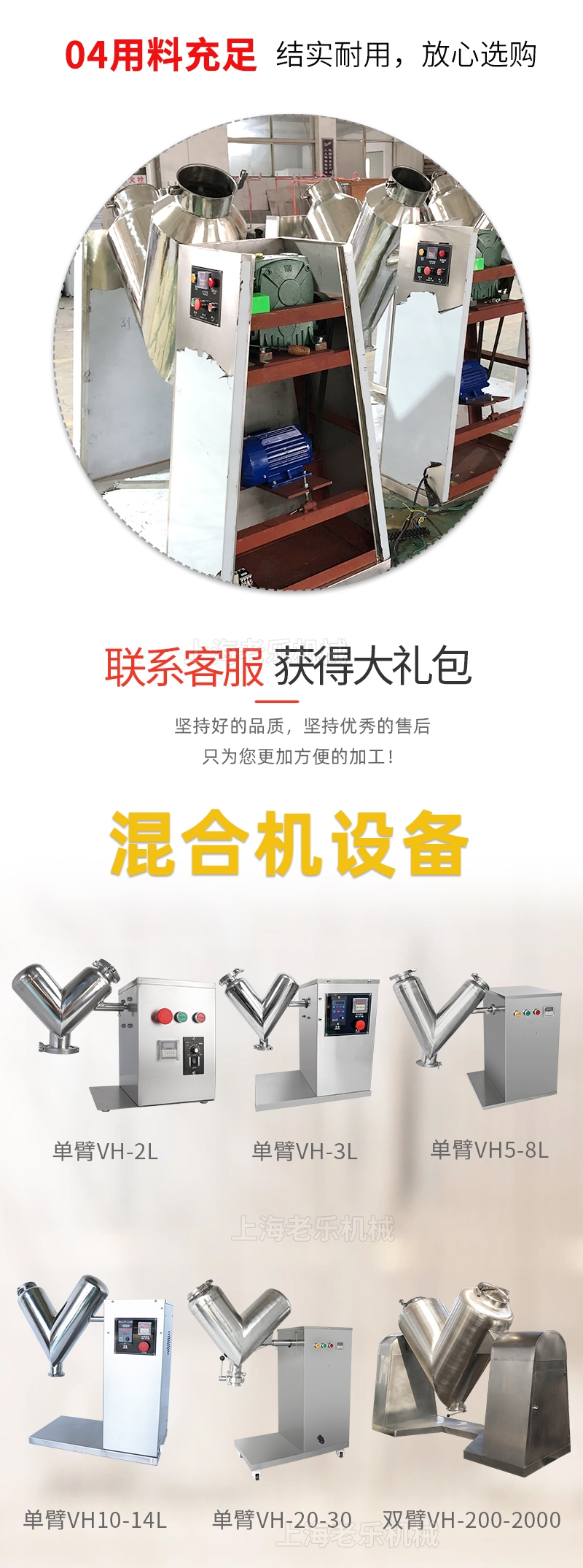 V型混合机用于一切流动性较好的干性粉状或颗粒状物料的混和。它适用于化工、食品、医药、饲料、陶瓷、冶金等行业的粉料或颗料状物料的混和。该机结构合理、简单、操作密闭,进出料方便,(人工或真空加料)筒体采用不锈钢材料制作,便于清洗。