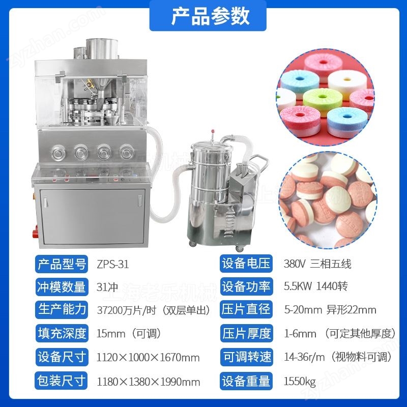 Related articles简要描述:01、双层片剂压制,外包不锈钢,整体设计美观简洁,运行平稳,噪音小02、需要连接吸尘器,方便分层效果03、可安装圆形、异形模具,其他模具可定制,方便更换04、双压单出,产量高,可调速,片剂重量可调